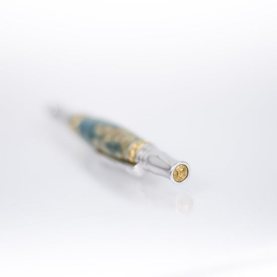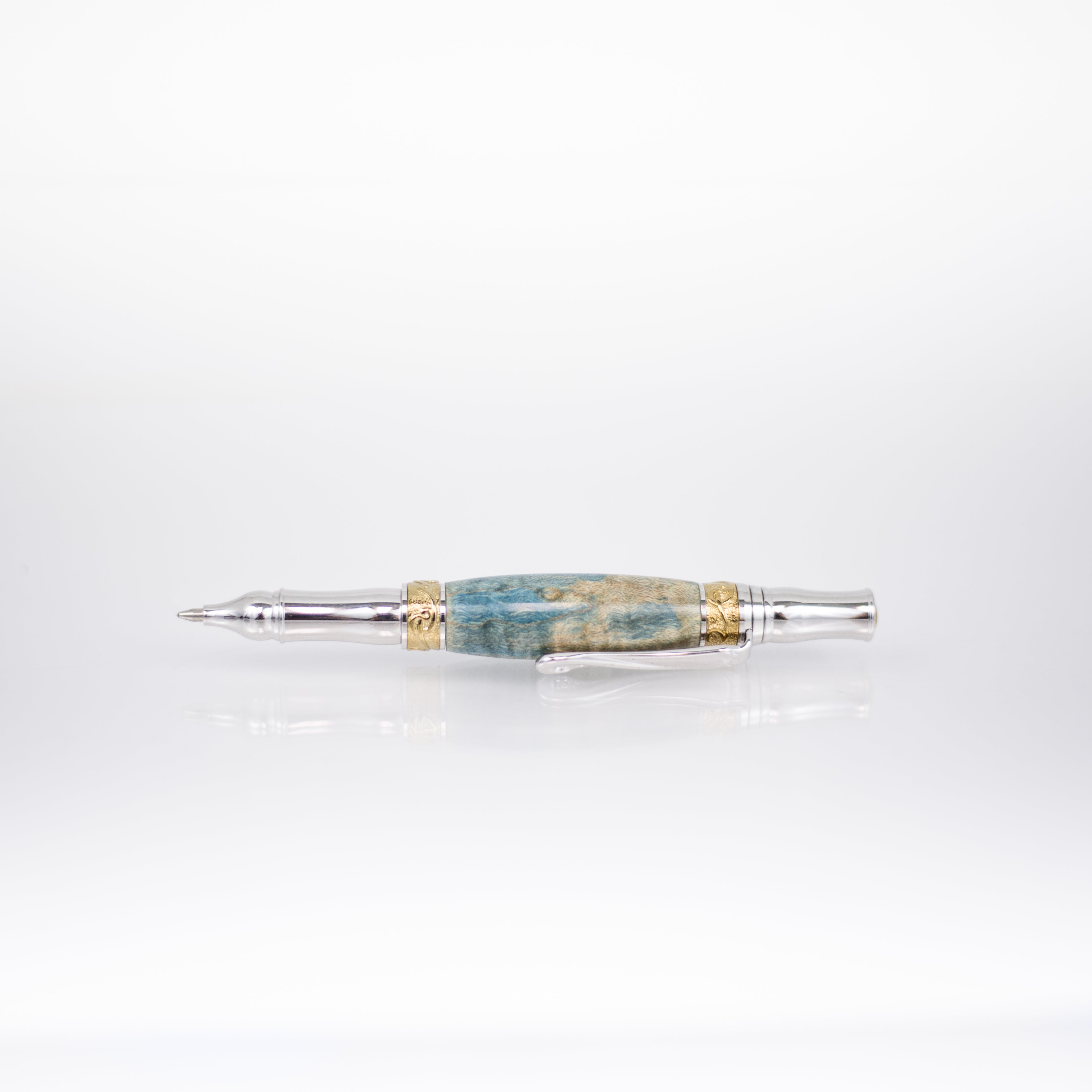 Heirloom Handcrafted Blue Dyed Curly Maple Ink Pen with Metal Body and 24k Gold