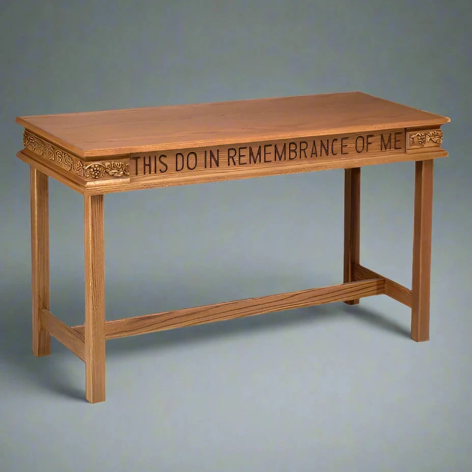 This communion table features an exquisite grape and leaf design, adding a touch of sophistication and reverence to your sanctuary. Its classic style and attention to detail make it a standout piece, ideal for enhancing the overall aesthetic of any worship space.