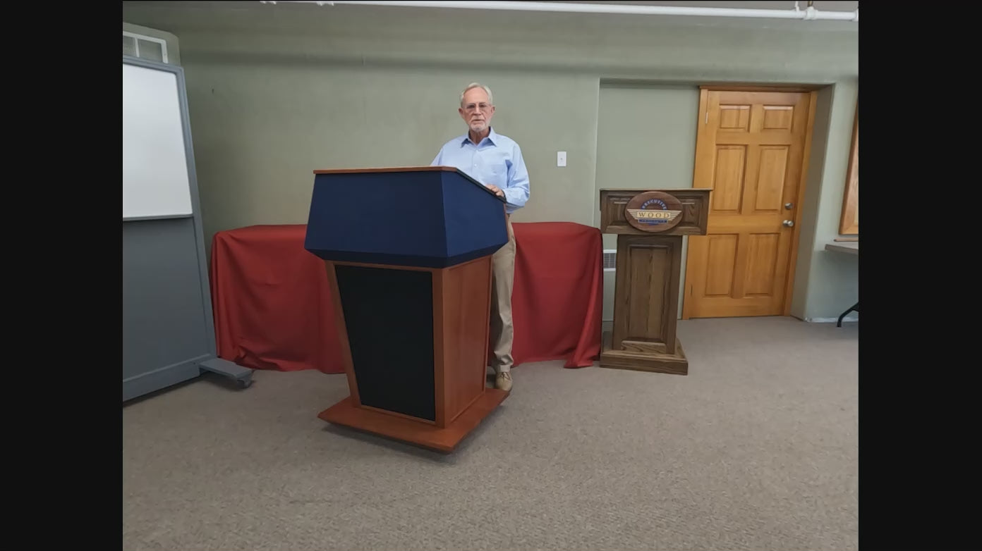 Command the stage with the Presidential Plus Evolution™, a premium large-scale sound podium designed for auditoriums, conference halls, corporate events, and government functions. Crafted in the USA from solid walnut, cherry, oak, or mahogany, this high-end wooden lectern delivers stunning American craftsmanship and powerful built-in sound performance.